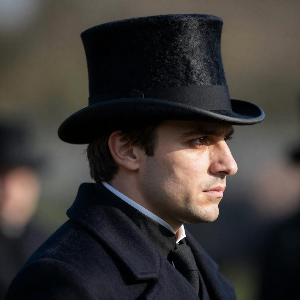 Photograph of a man in profile, wearing a black top hat and dark coat, with a shadowed face and intense expression. Sunlight highlights his right cheek and nose. Background is blurred, with dark and golden tones. His dark hair is slightly visible under the hat.