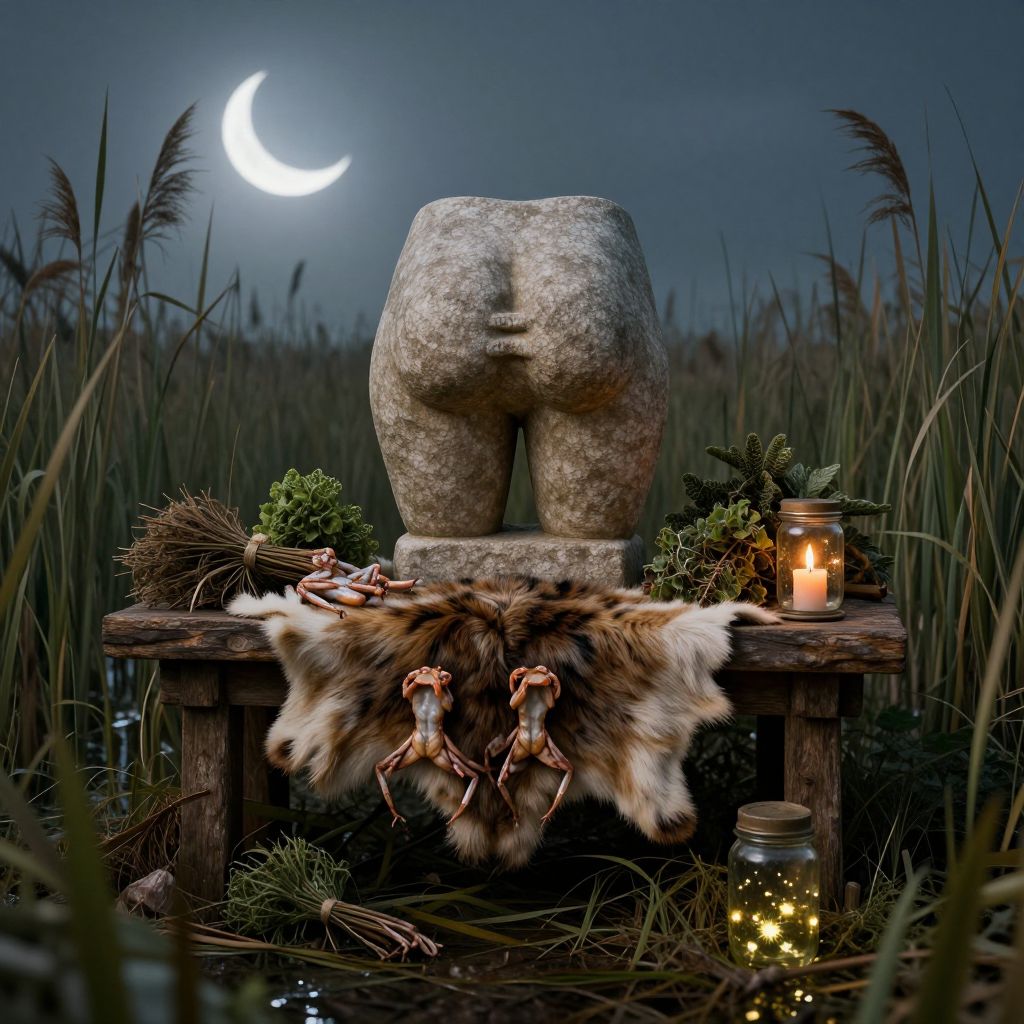 4lt4r digital concept art of a rustic altar tucked within a swamp overgrown with reeds, its surface covered with an animal skin, A stone sculpture shaped like a human buttocks, with exaggerated proportions, rest atop the altar, as well as some dried frog legs, bunches of swamp herbs, lit candle and a glass jar with some fireflies inside, crescent moon glows in the sky creating magical atmosphere