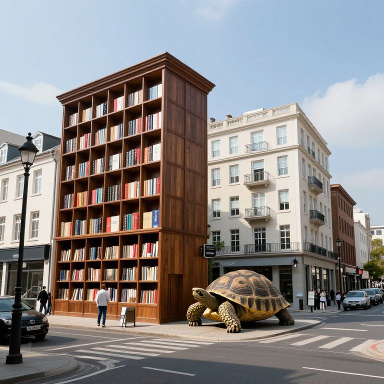 Photograph of a city street corner featuring a large, realistic turtle sculpture standing on the sidewalk in front of a modern, multi-story building with a wooden facade and numerous bookshelves filled with red, blue, and white books. The building is adjacent to a white, traditional-style building with balconies. The street has a zebra crossing and a black streetlamp. The sky is clear and blue. A few pedestrians are visible, including a person in a white shirt and blue jeans standing near the book-filled building. Cars are parked along the street.