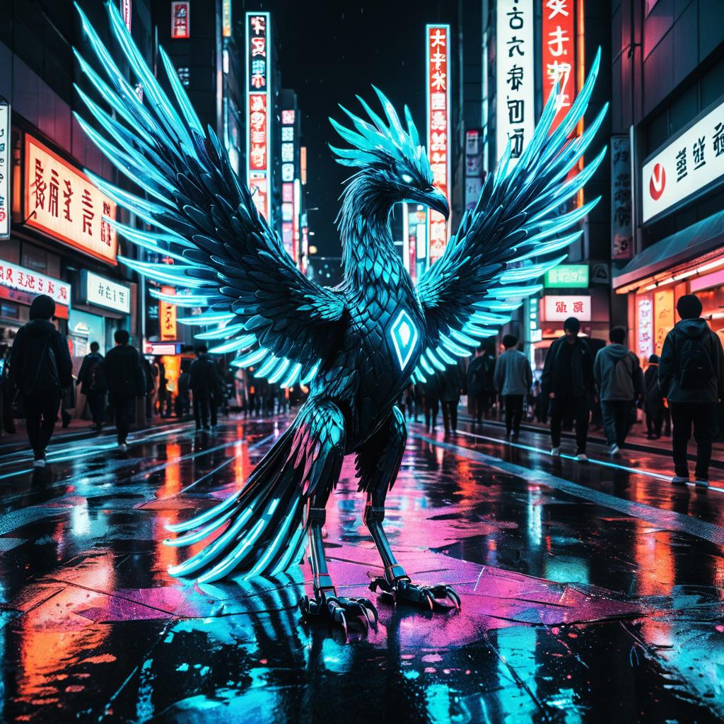 Dynamic illustration of a cybernetic phoenix in neon Tokyo streets. The piece features glowing holograms, reflective wet pavement, blending cyber, futuristic, and retro elements for a visually stunning artwork.