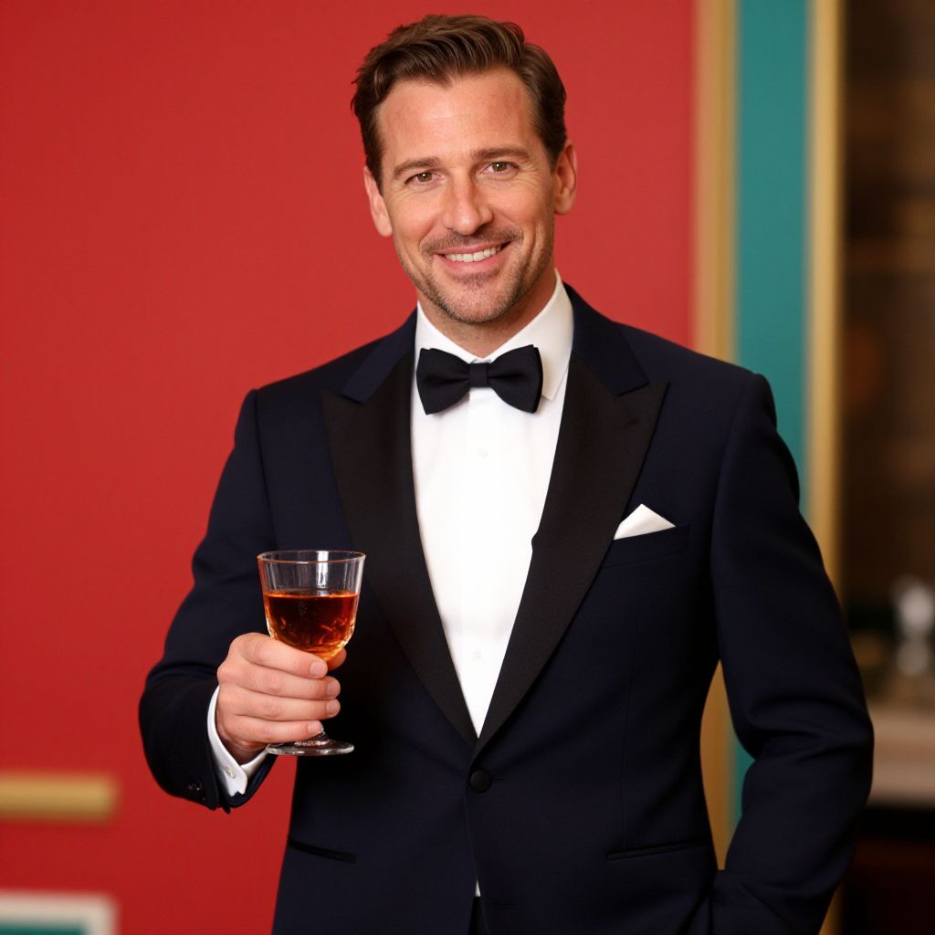 A stylish man dressed in a sharp tuxedo is holding a cocktail, showcasing a confident smile. The vibrant background accentuates his polished look, creating a classic, sophisticated atmosphere perfect for elegant occasions.