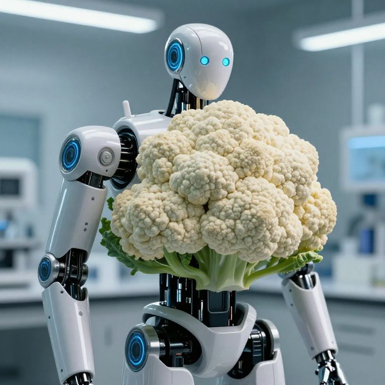 Cauliflower Effect A highly detailed photograph of a super intelligent humanoid robot. There is cinematic lighting. The background is a bright laboratory.,