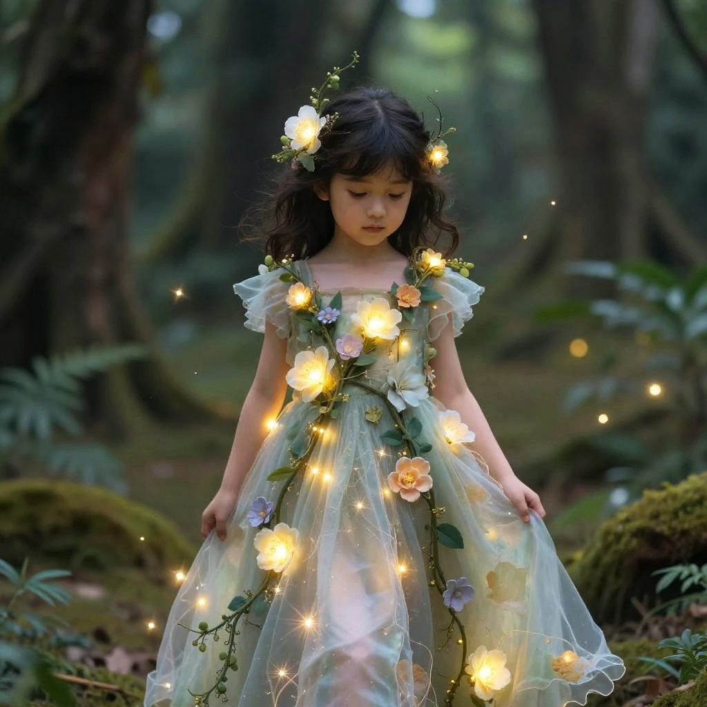 Photograph of a blonde woman in a moss-covered, vintage dress, wearing a floral crown, playing a gramophone on a mossy pedestal in a