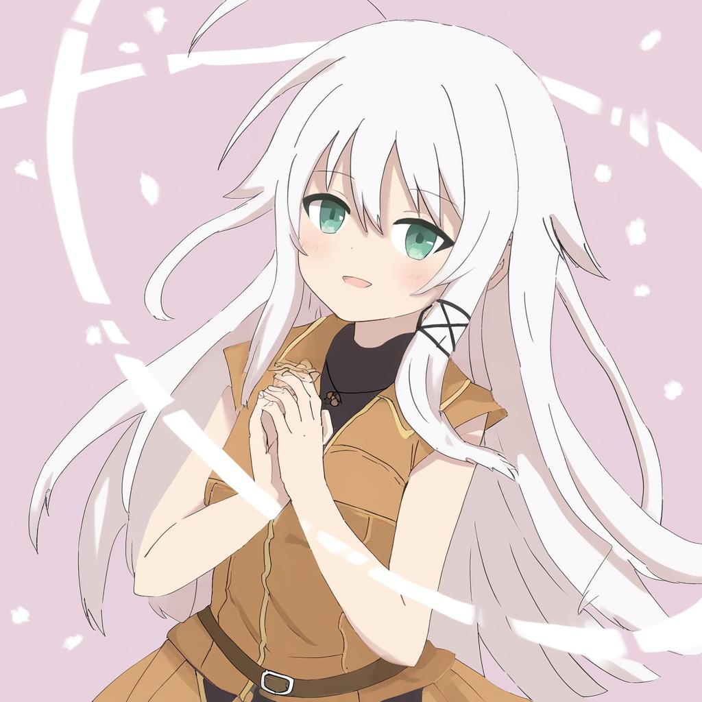 Digital anime-style illustration of a young girl with long white hair and green eyes, wearing a brown sleeveless outfit with a black undershirt. The girl has a delicate expression with hands clasped together and a soft pink background with glowing white shapes surrounding her.