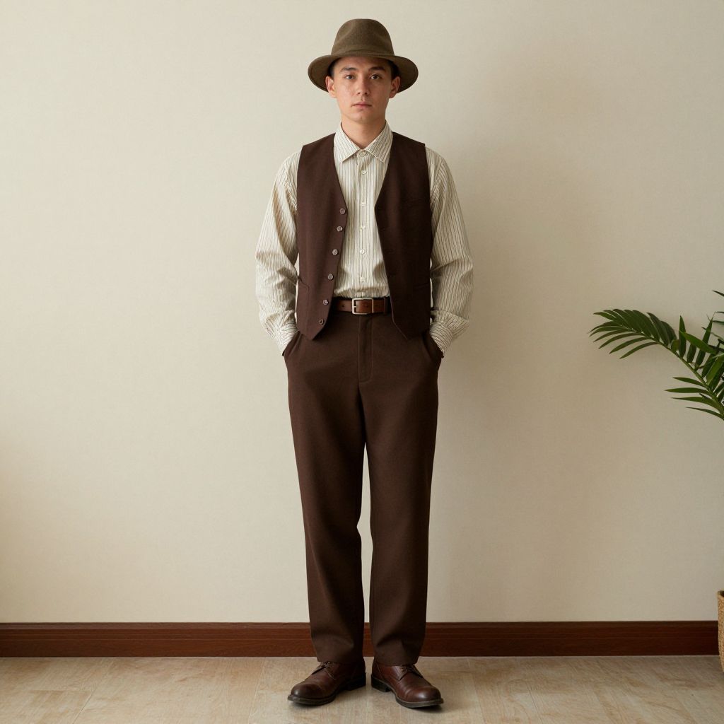 Retro aesthetic outfit, 1boy, male focus, solo, hat, shirt, pants, belt, full body, looking at viewer, brown pants, vest, standing, hands in pockets, collared shirt, plant, brown footwear, shoes
