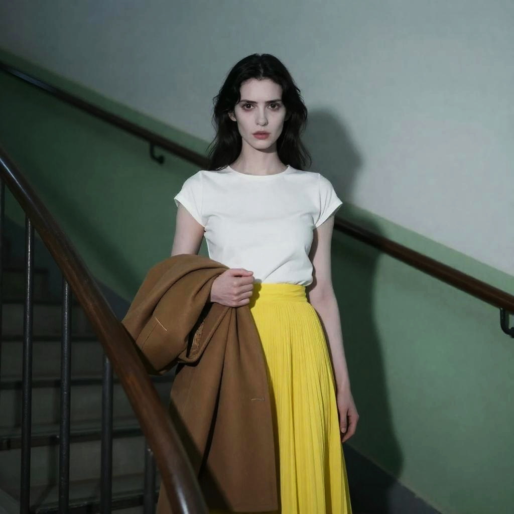 Photograph of a woman with long dark hair, pale skin, and intense expression, standing in a doorway. She wears a white, long-sleeved blouse and blue jeans. Green door on left, ured glass on right. Her right arm is raised, touching the door frame.