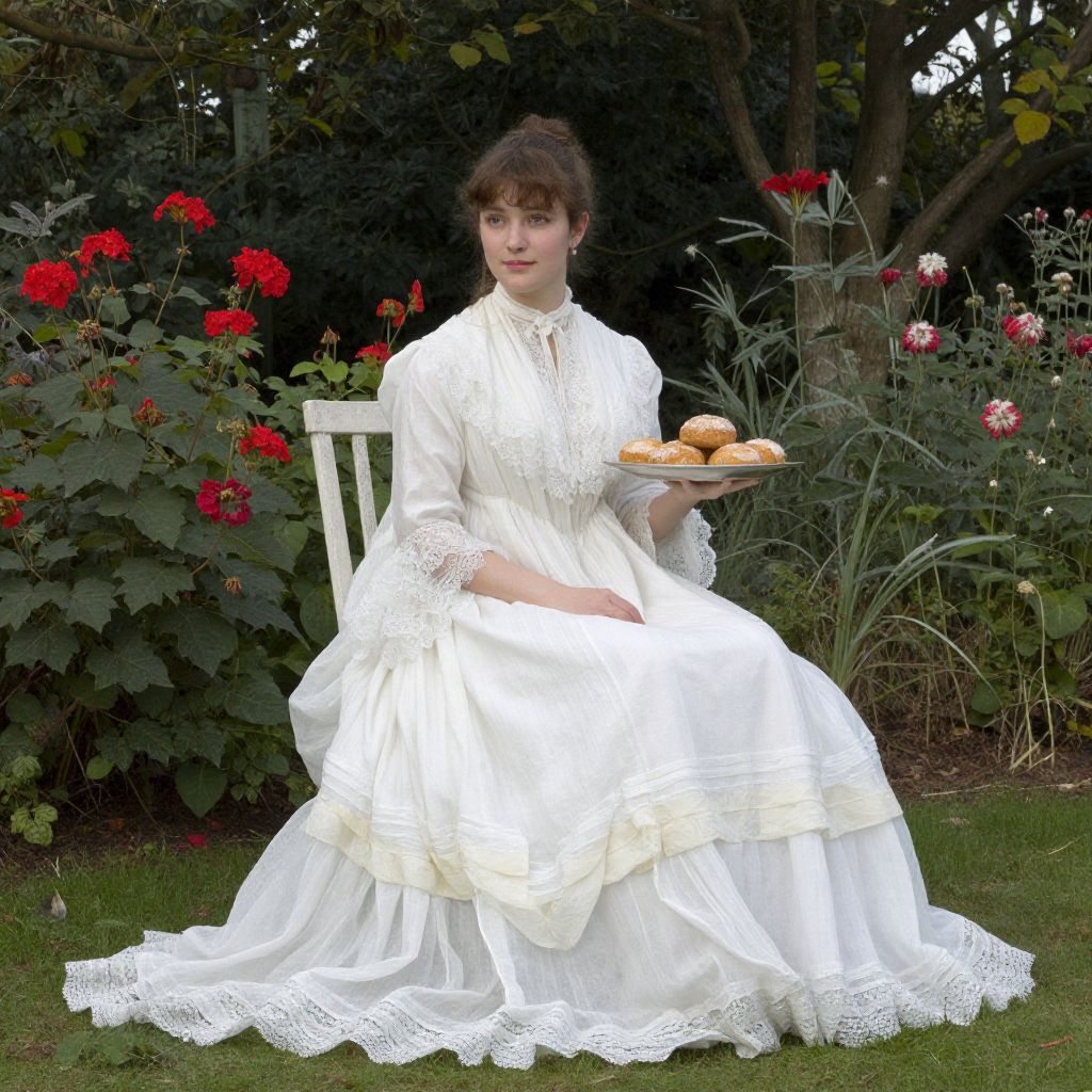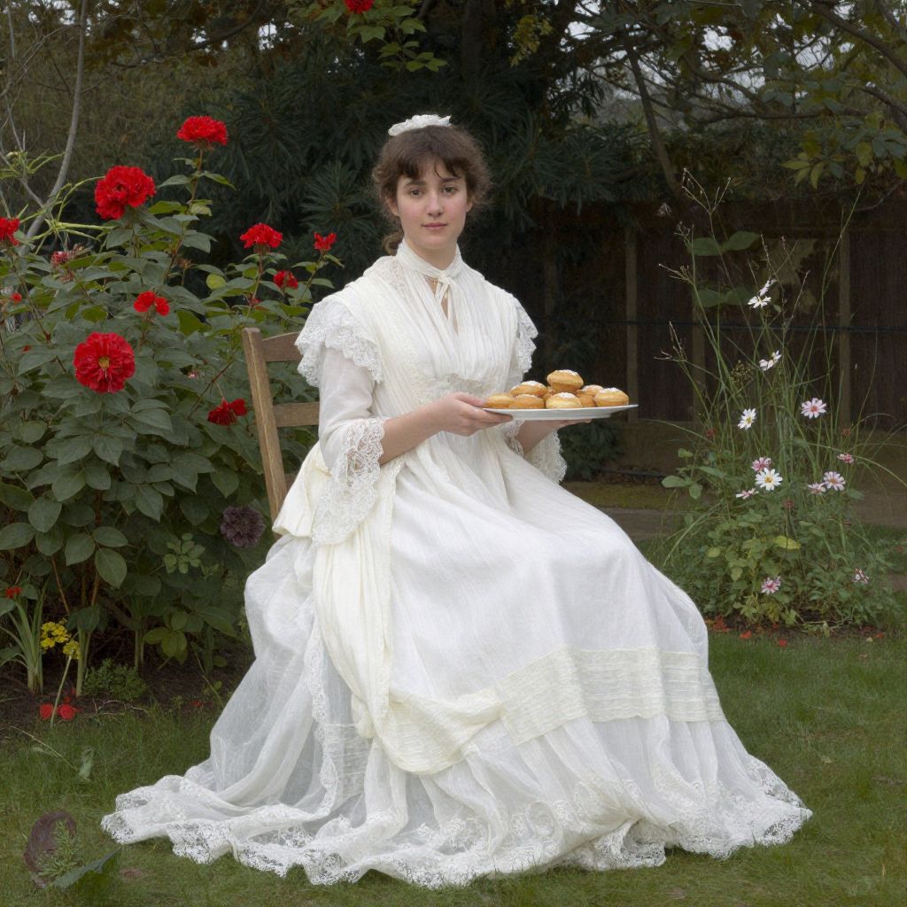 Photograph of a fair-skinned woman with brown hair in an updo, wearing a white, lace-trimmed Victorian-style dress with long sleeves and a high collar. She sits on a white wooden chair in a lush garden, holding a silver tray with several pastries. The background features tall red and white flowers, green foliage, and a grassy lawn. Her expression is calm and composed, and the overall setting evokes a serene, vintage atmosphere. The image highlights the contrast between her white dress and the vibrant garden.