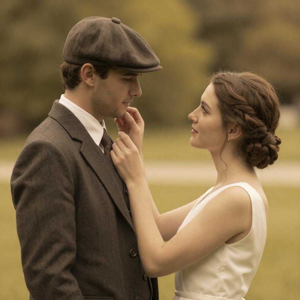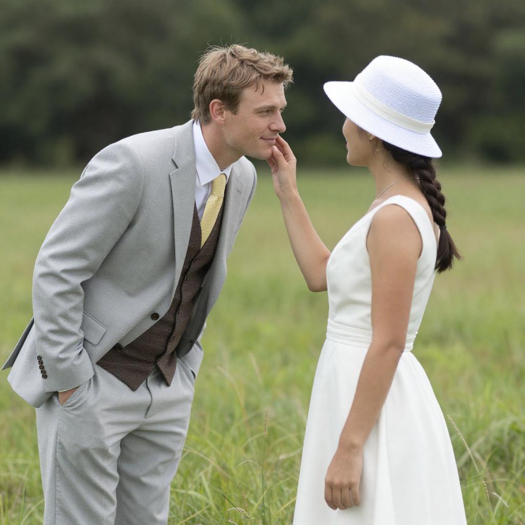 Photograph of a man and woman in a grassy field. Man in light gray suit, white shirt, yellow tie, brown vest, light brown hair, leaning forward. Woman in white dress, white hat, dark brown hair in braid, facing him, touching his cheek. Both looking at each other with gentle smiles. Tall grass in foreground, blurred trees in background. Man on left, woman on right.