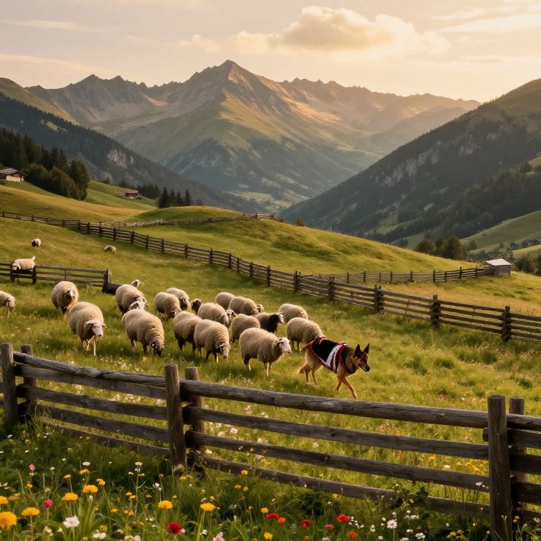 Photograph of a picturesque Alpine meadow at sunset. A group of woolly sheep grazes on green grass beside a wooden fence in the foreground, with a German Shepherd dog walking nearby. The background features rolling hills and rugged mountains, partially covered in dark green forests. The sky is a gradient of warm oranges and soft pinks. Wildflowers, including yellow and red blooms, dot the meadow. The scene is bathed in golden sunlight, highlighting the natural beauty and tranquility of the rural landscape.