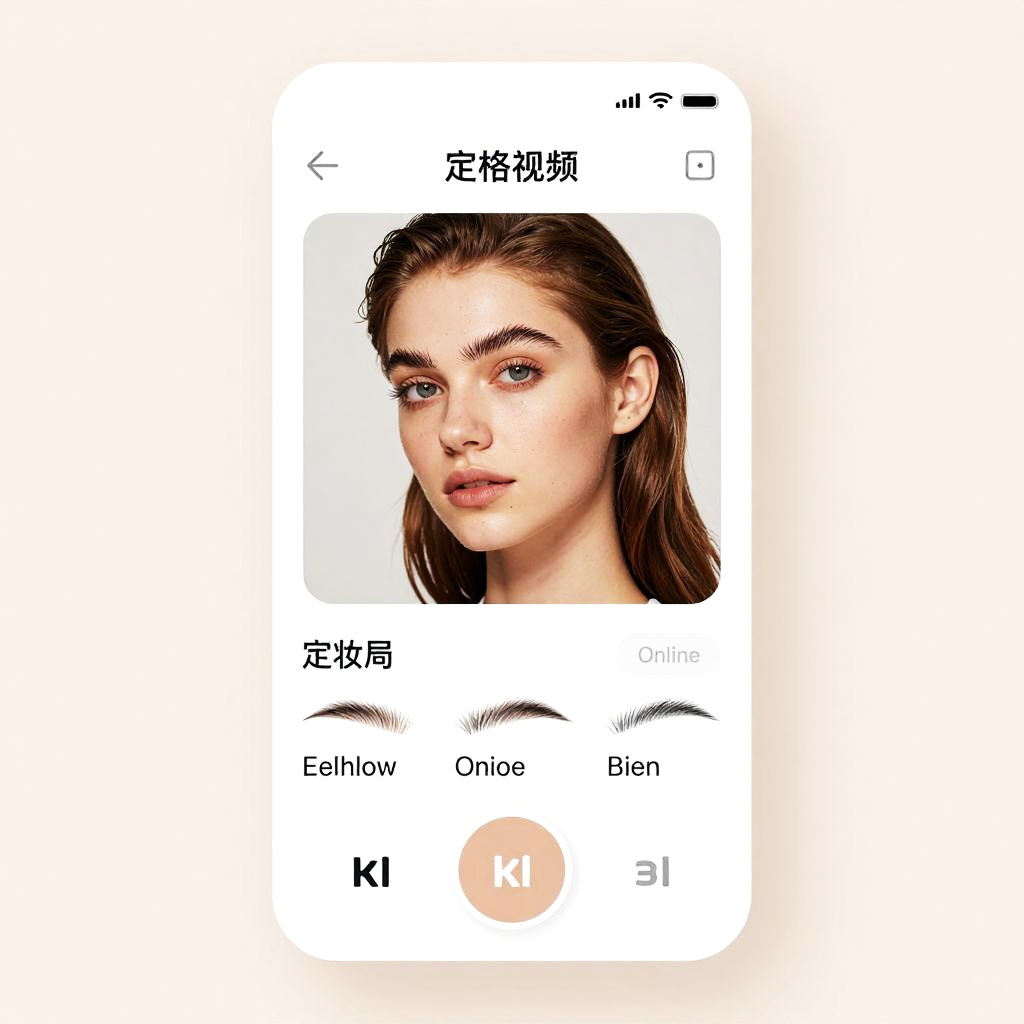 Eyebrow filter online user interface, sleek modern app design showing various eyebrow shapes and color options, realistic digital makeup preview on female face, soft natural lighting with UI elements in pastel colors, high resolution