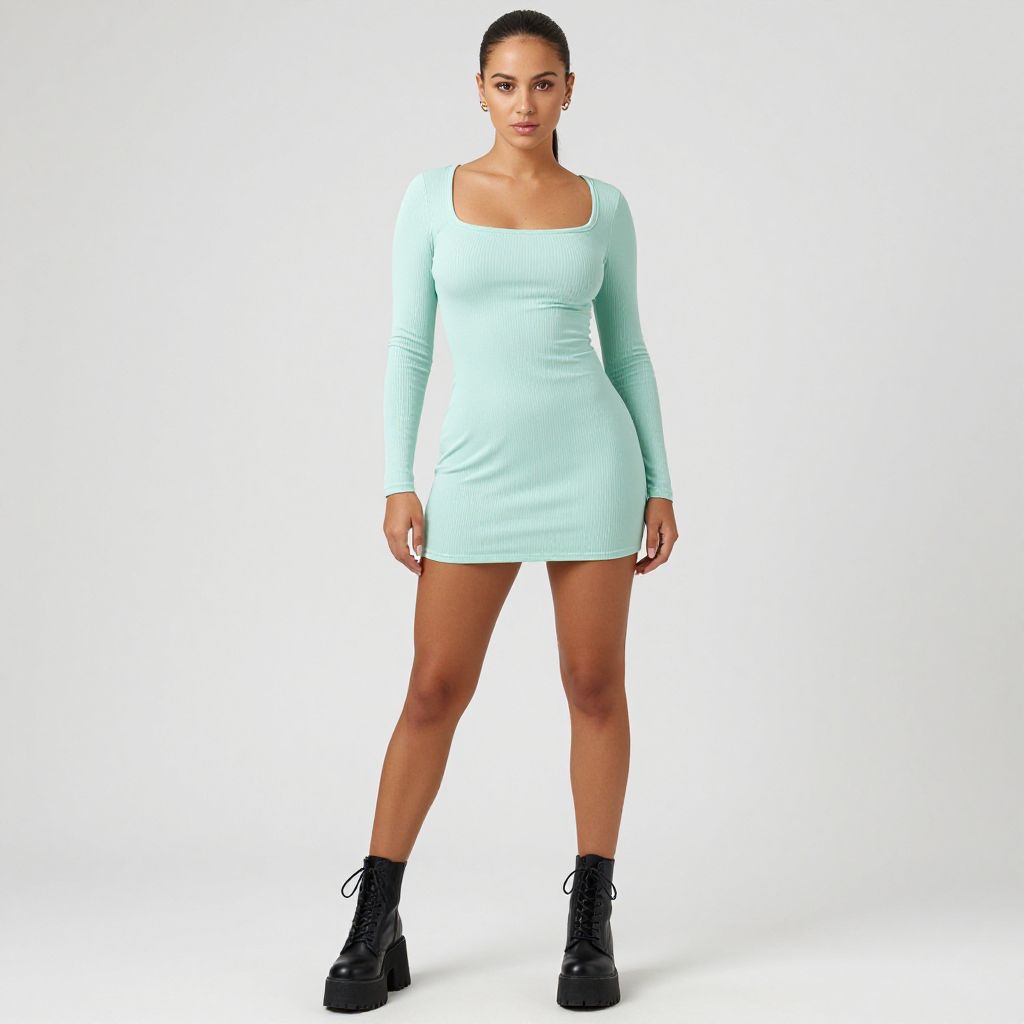 "Woman, contemporary street style, ribbed mini dress in pastel mint green, square neckline with thin straps, long sleeves, fit-and-flare silhouette, short hemline, paired with black lace-up boots with chunky platform soles, simple stud earrings, hair pulled back into a ponytail, plain white studio background.. Sexy. Pretty face and beаutiful eyes. Big breasts."