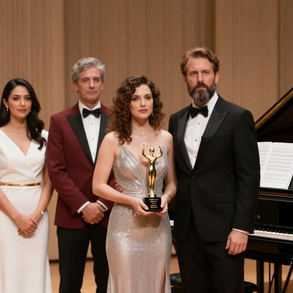Formal award ceremony featuring a central woman with curly brown hair in a silver sequined dress holding a gold trophy. She is flanked by a bearded man in a black tuxedo and a dark-haired woman in a white dress, alongside a man in a red tuxedo. The setting includes wooden panel background and a grand piano with sheet music.