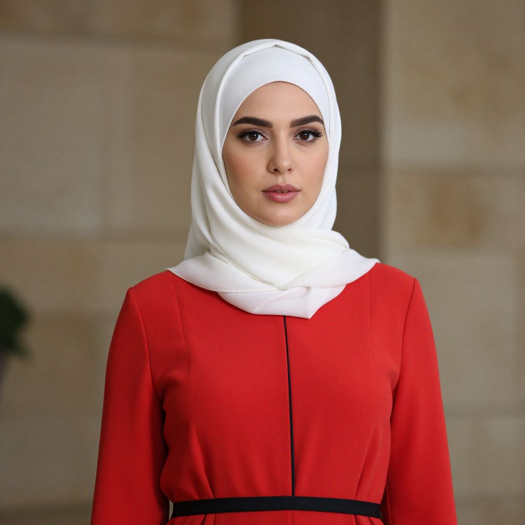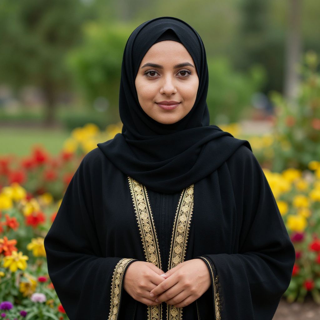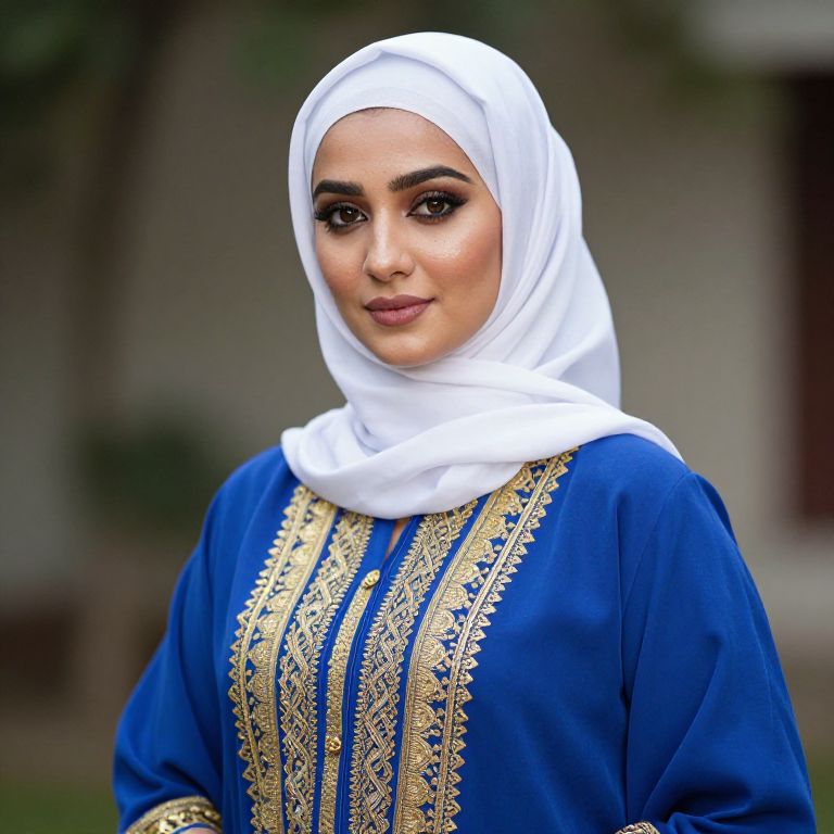 Female wearing a blue and gold outfit with a white turban on her head.