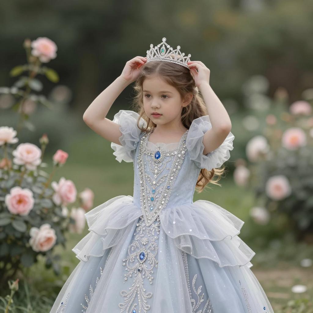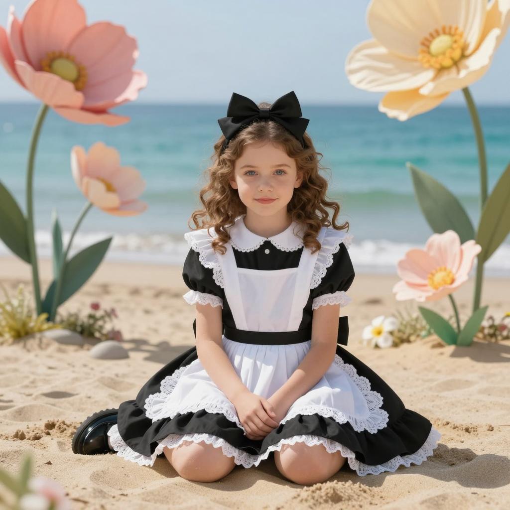 Portrait of a young girl with curly brown hair and blue eyes wearing a black and white vintage-style dress featuring lace details and a large bow headband. She is kneeling on a sandy beach surrounded by colorful oversized flowers, with turquoise sea waves blurred in the background, creating a whimsical and enchanting atmosphere.