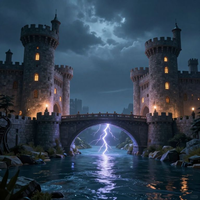 Digital artwork of a medieval castle with two towers, glowing windows, and a dramatic lightning bolt striking through a stone arch bridge over a flowing river at night