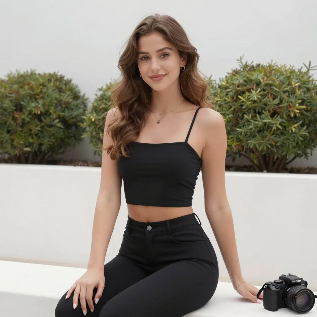 Photograph of a young woman with long brown hair, smiling, sitting on green grass with legs crossed. She wears a black sleeveless top, rolled-up blue jeans, and black-and-white sneakers. Behind her are evergreen trees and a beige house. She has a light skin tone and a relaxed, casual pose.