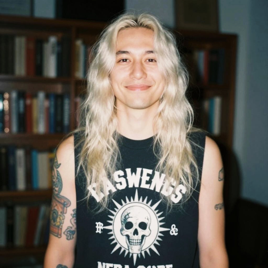 A blurry photograph of a guy with long, wavy white hair wearing a black sleeveless shirt with a white graphic design. He's smiling slightly and standing indoors with a bookshelf in the background. The lighting is dim, and the image has a grainy, vintage feel. His tattooed arm is partially visible on the left.