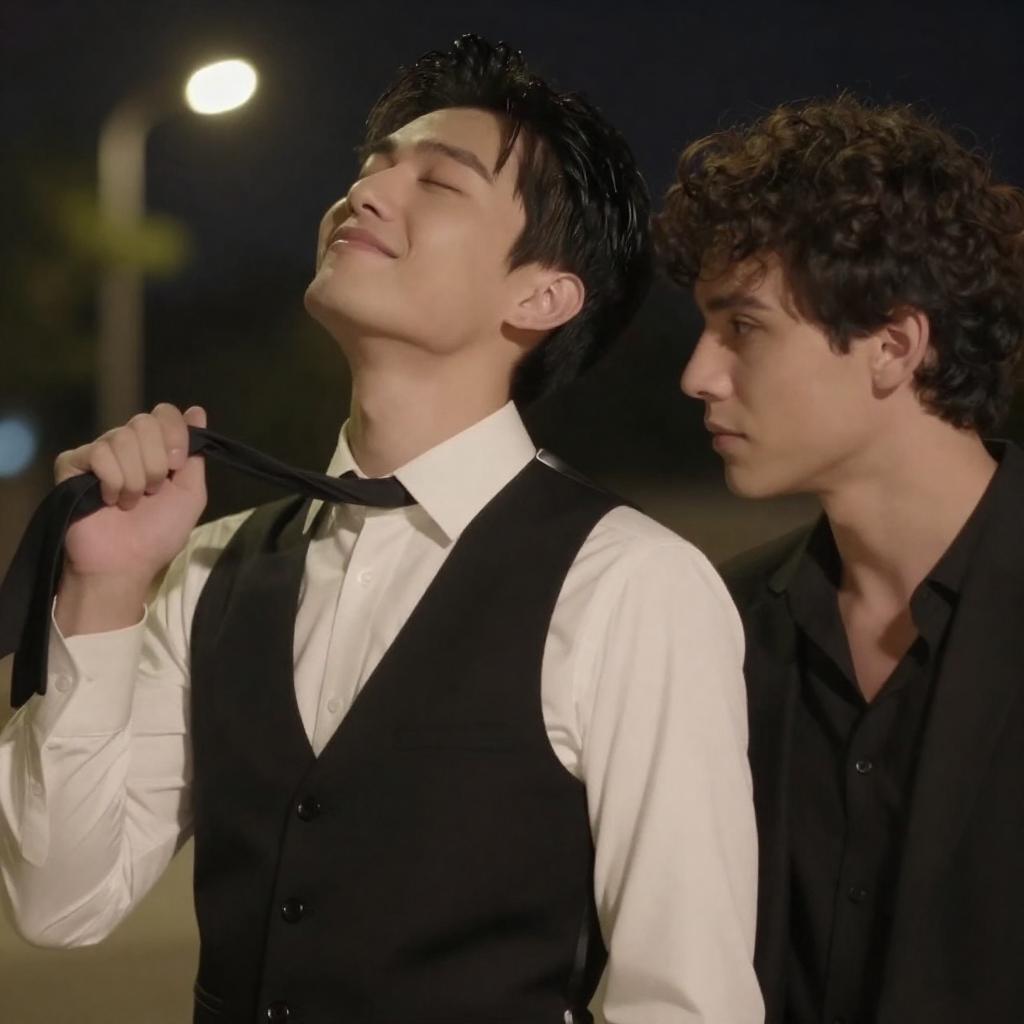Photograph of two young men in black suits. One with short brown hair, open mouth, looking to the left. The other with short dark hair, focused, gripping his shoulder. Background is blurred. Both have serious expressions. Upper body focus.