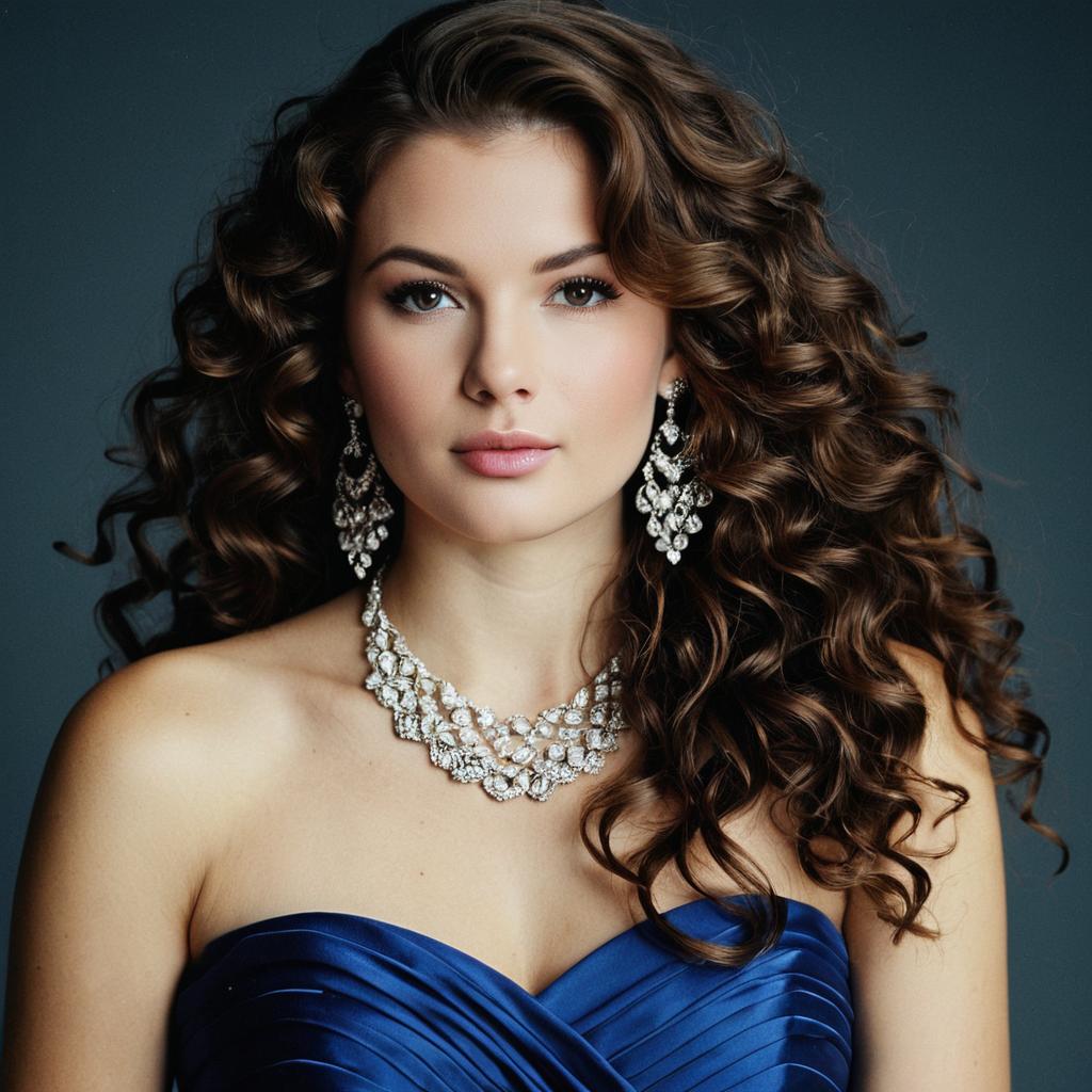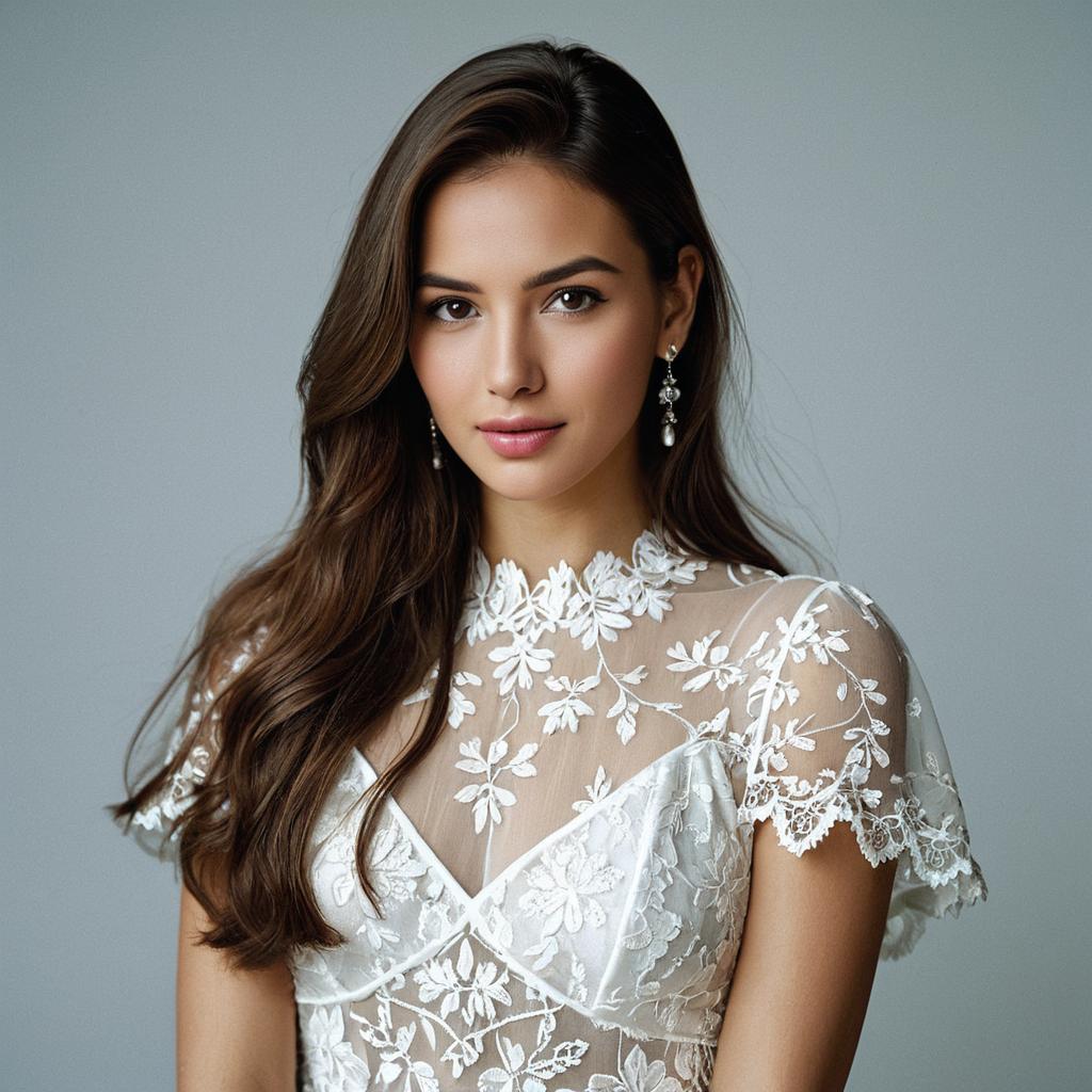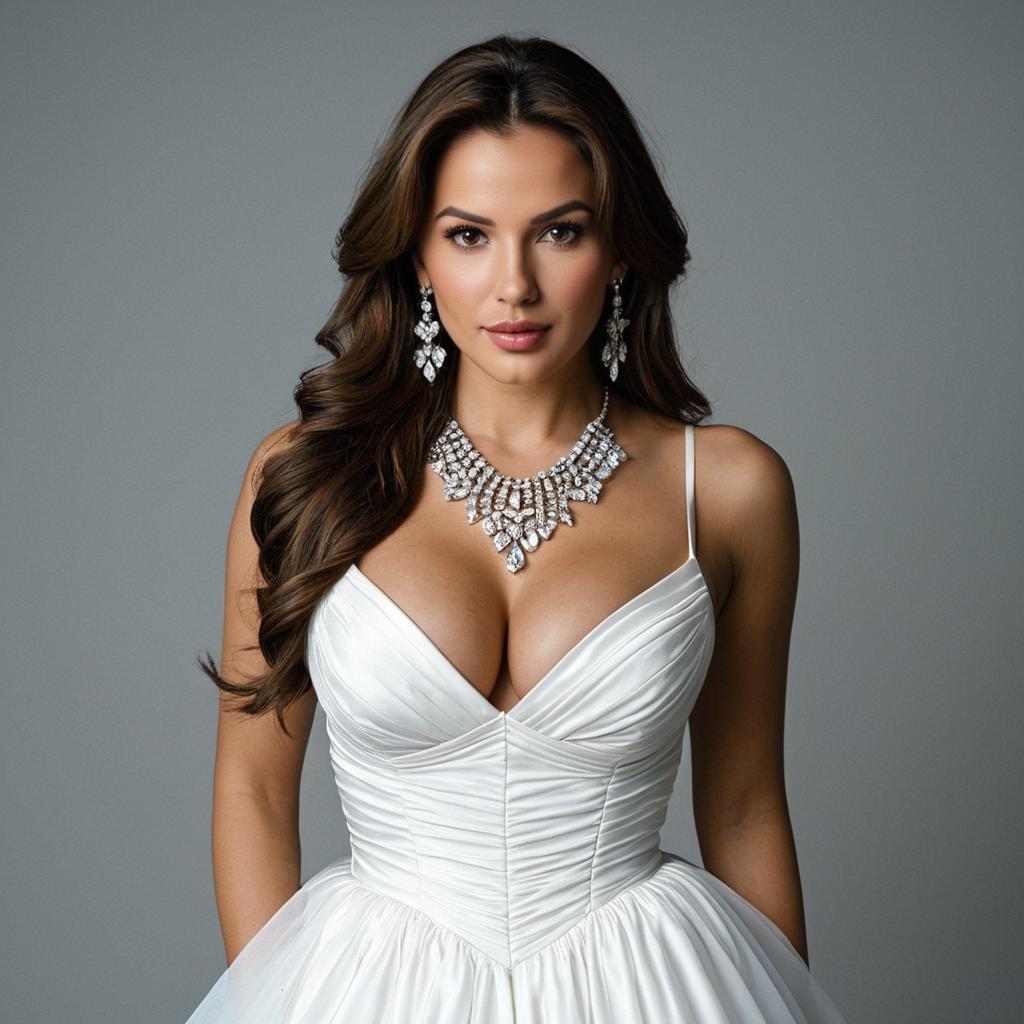 Silver diamond dress ,1girl, solo, jewelry, dress, earrings, brown hair, long hair, realistic, white dress, see-through