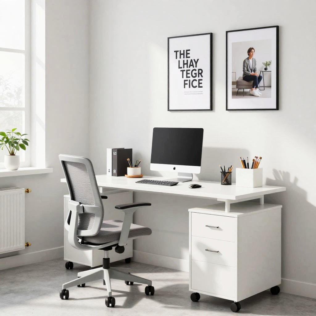 Small study room ideas with bright natural light, sleek white furniture, ergonomic chair, motivational posters on the wall, organized desk accessories, Scandinavian aesthetic