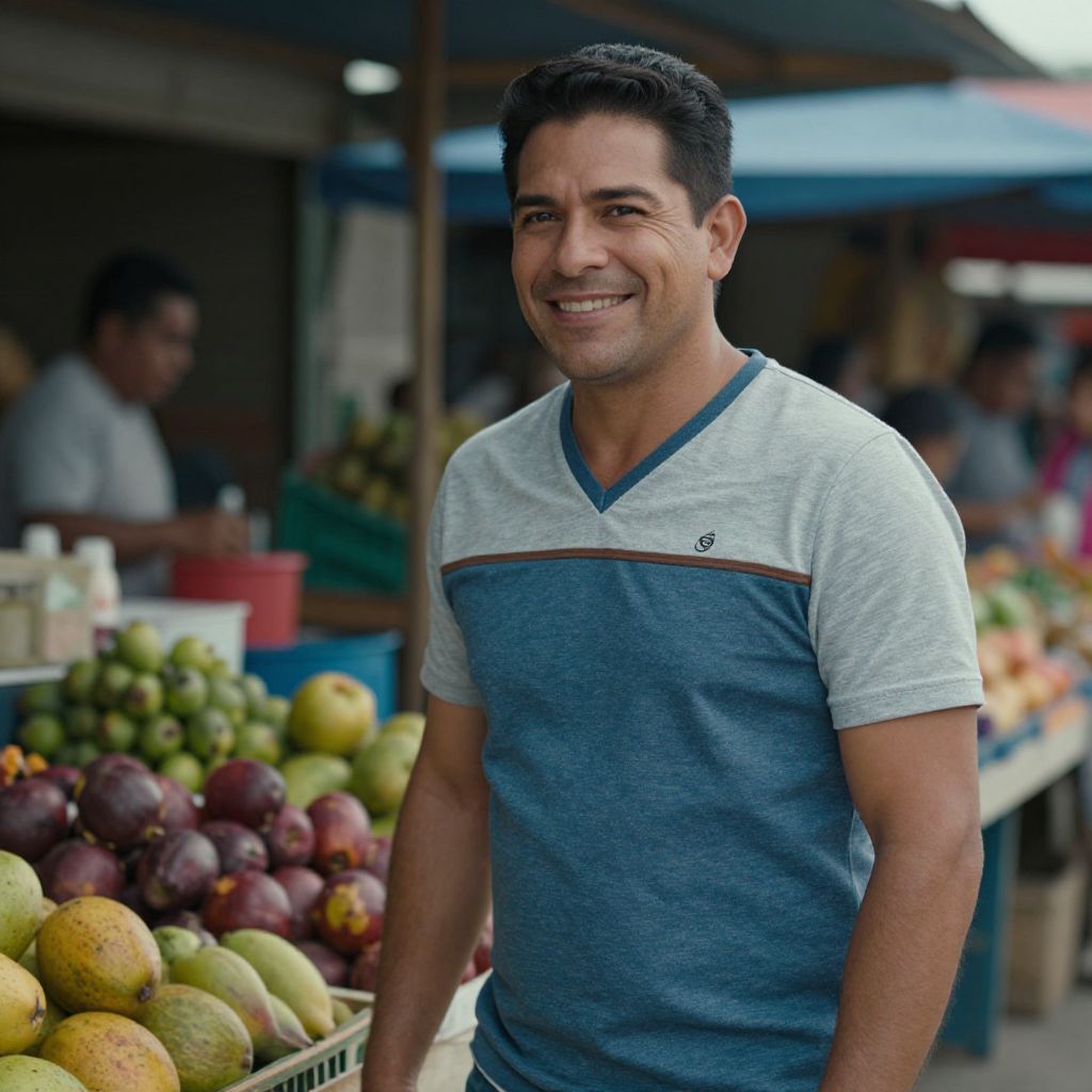 El Salvadorian man smiling warmly, wearing casual modern attire, market scene with colorful stalls and local fruits, natural lighting, cinematic composition