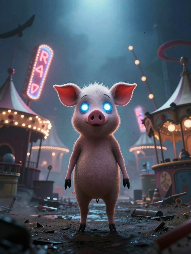 Spooky stylized piglet character standing upright in the center of a ruined carnival, huge glowing eyes staring at the viewer, long skinny limbs, surrounded by toppled clown booths and flickering neon signs with broken attractions and debris, drifting ash filling the air, cinematic wide-angle shot, dark whimsical fantasy style, highly detailed 3d illustration, soft volumetric eerie blue light light, high resolution