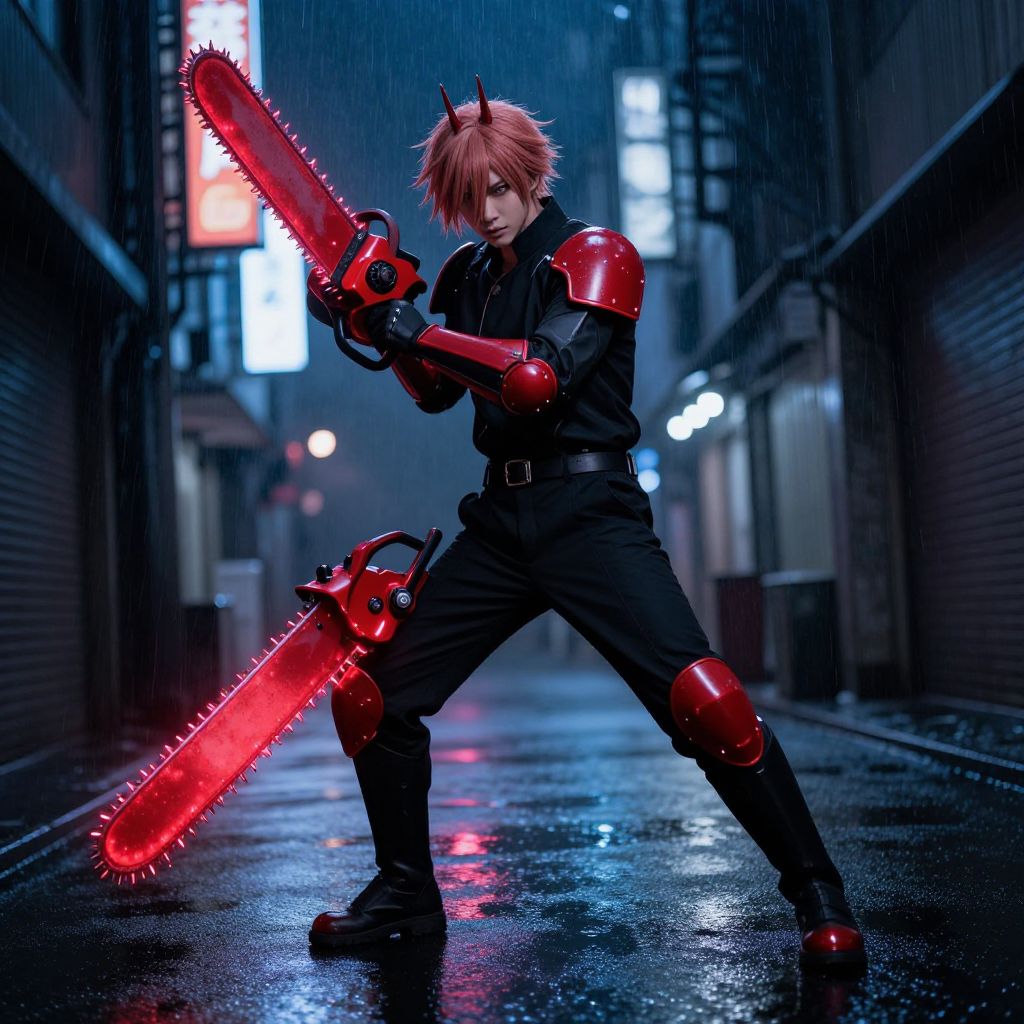 Photograph-like CGI image of a young man with spiky orange hair and black horns, wearing a black outfit with red armor on his shoulders and knees. He stands in a rain-soaked, neon-lit alley, holding a large, glowing red chainsaw in a fighting stance. The background features blurred, illuminated signs and wet, reflective pavement. His intense expression and dynamic pose convey readiness for action. The vivid red of the chainsaw and armor contrasts sharply with the dark, moody alley setting.