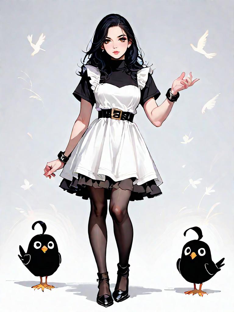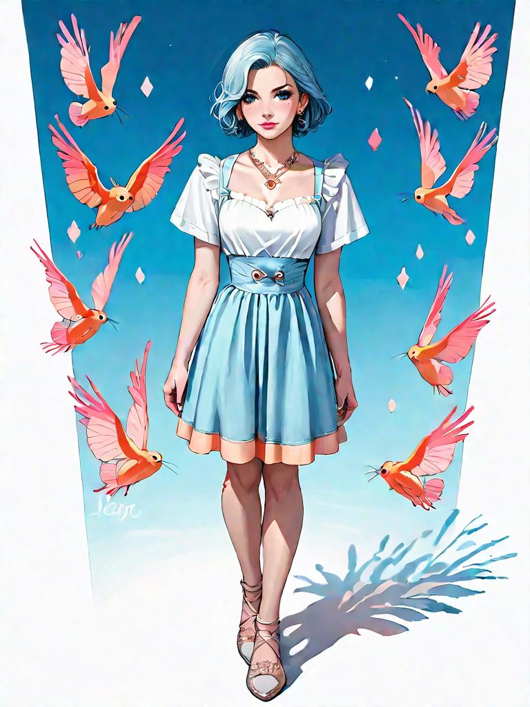 Illustration of a young woman with long black hair wearing a white knee-length dress over a blue collared shirt, paired with white heels. She stands confidently with a circle of light behind her against a blue sky background, accompanied by two small yellow birds and stylized blue foliage at her feet.