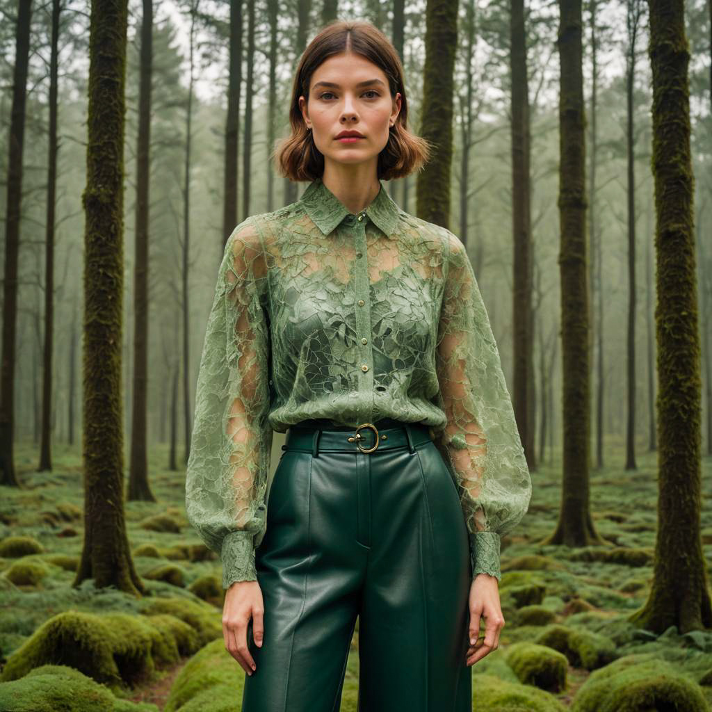 Portrait of a woman with textured shag haircut wearing a sheer lace forest green top paired with high-waisted tailored leather culottes, standing in a misty mossy forest setting. The outfit features delicate lace details and a black belt, creating an elegant and ethereal look.