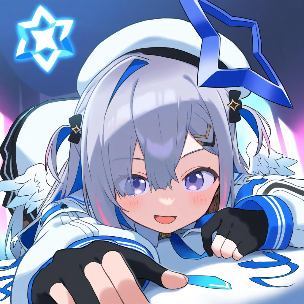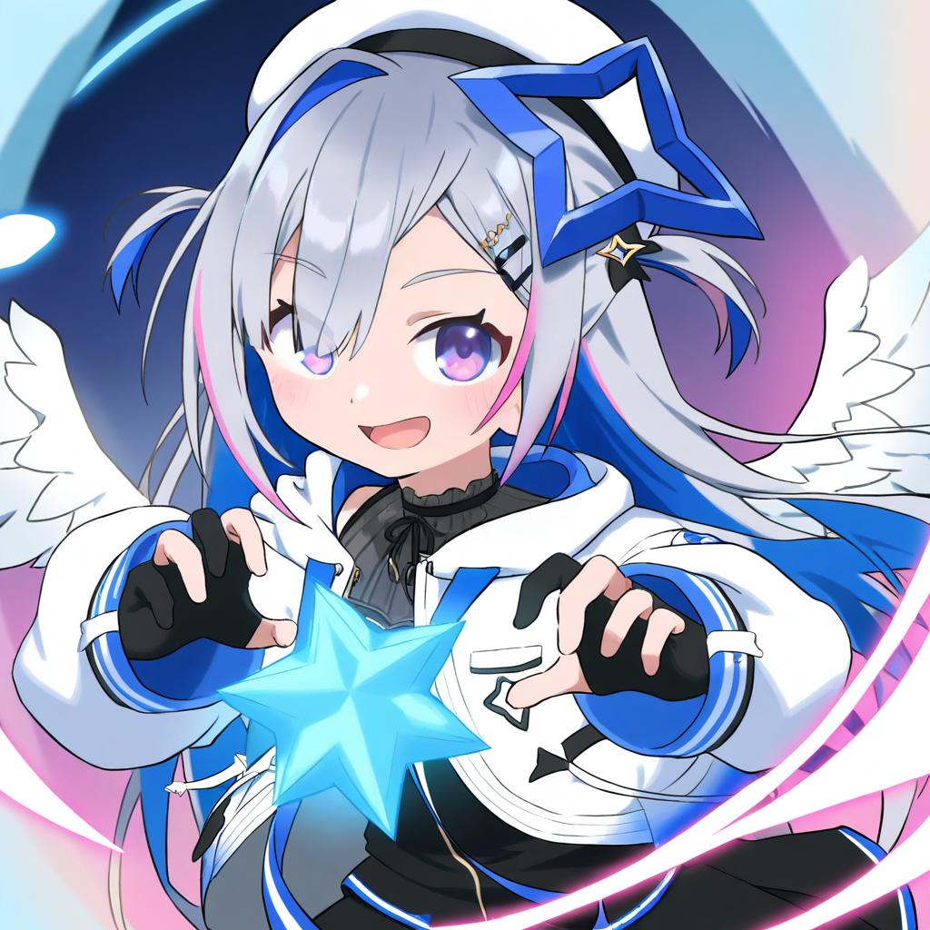 Amane kanata (work), hololive, 1girl, angel wings, angel, angel wings, purple eyes, hair over one eye, blue hair, grey hair, colored inner hair, single hair intake, official alternate hairstyle, long hair, official alternate hair length, streaked hair, pink hair, asymmetrical bangs, two side up, hairclip, black gloves, partially fingerless gloves, white jacket, black dress, white headwear, star halo, virtual youtuber, virtual youtuber, feathered wings, white wings, mini wings, feathered wings, white wings, mini wings, beret, by artist bubukka, animagine