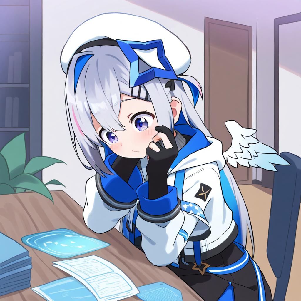 Digital anime-style illustration of a young girl with long grey and blue hair, purple eyes, and angel wings. She is wearing a white beret, a white jacket with blue accents, black partially fingerless gloves, and a black dress. The girl is seated at a wooden desk with papers and blue folders, looking thoughtful. The background shows a modern indoor setting with a plant and door.