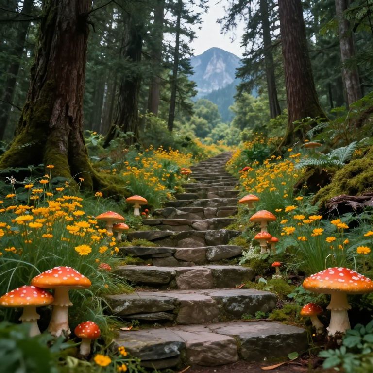 Spiraling stone steps descend gracefully through a lush, enchanted forest, each tier adorned with vibrant orange mushrooms and golden wildflowers, while towering trees and distant mountains frame the ethereal scene.