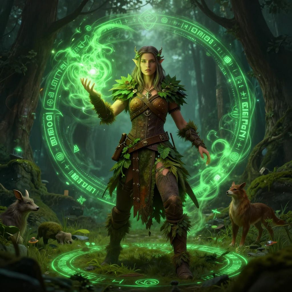Female druid 5e standing in an ancient forest clearing, surrounded by glowing magical runes and mystical animals, wearing natural leather armor with leaves and vines, casting a nature spell with vibrant green energy swirling around her, fantasy art style