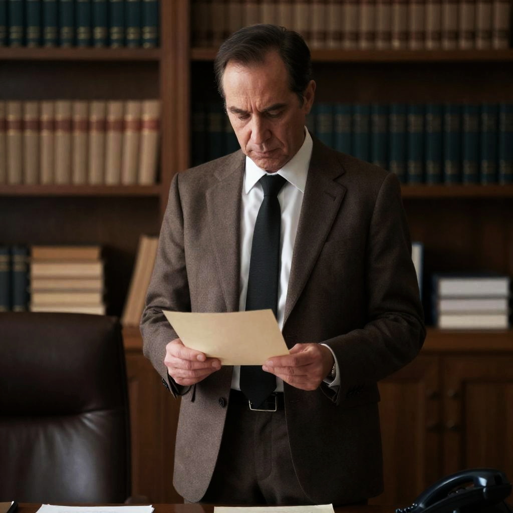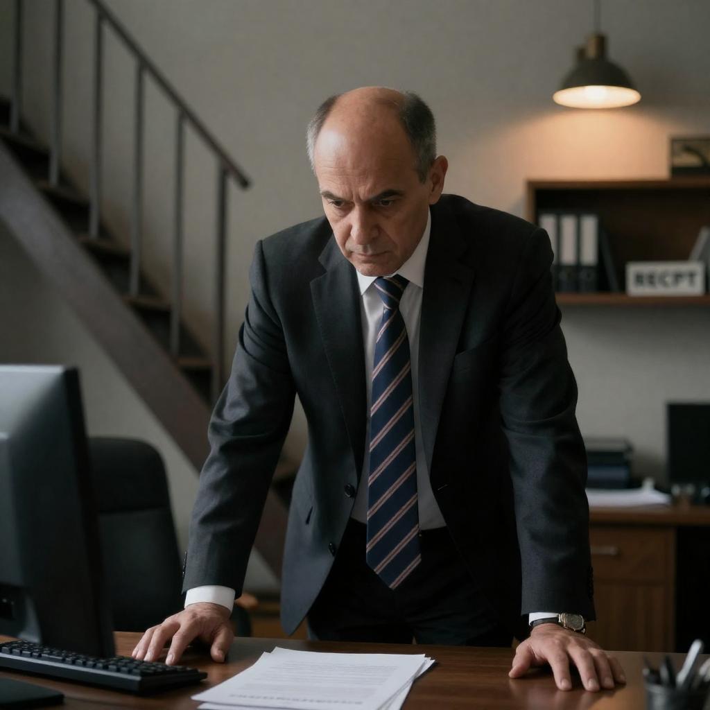 Middle-aged man in black suit with red-striped tie, holding a pen, standing in a cluttered office. Background: wall with maps, papers, and multiple photographs of people. Office desk with laptop, glass bottle, and papers. He has a serious expression. Office setting with fluorescent lighting.