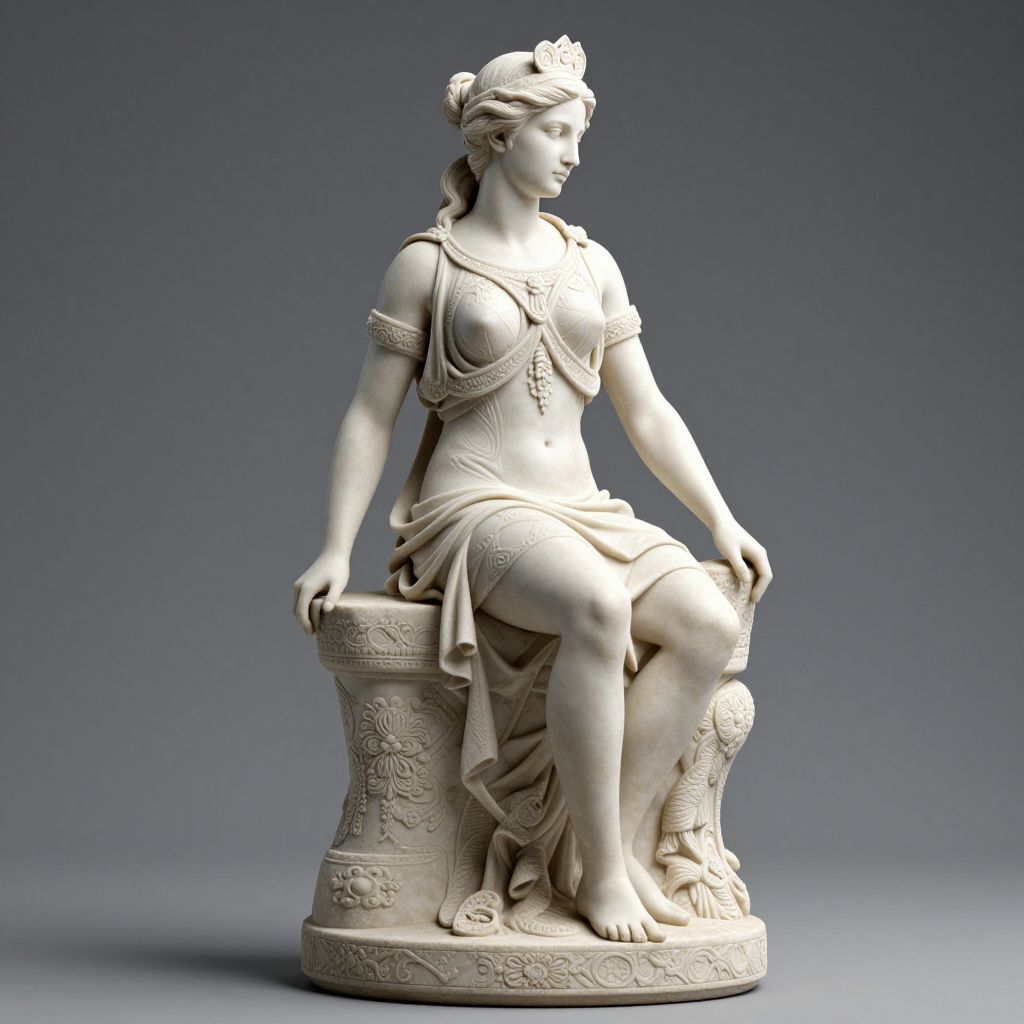 Photograph of a white marble statue depicting a classical Roman goddess-like woman seated on a intricately carved pedestal. She is adorned in a detailed, flowing Greek-style dress with arm bands and a draped shawl. Her right hand rests on the pedestal's edge, while her left hand gently touches her knee. She has a serene expression, with wavy hair partially tied up. The pedestal features ornate patterns and a small, carved figure at its base. The background is a solid, dark gradient, highlighting the statue's intricate details and classical elegance.