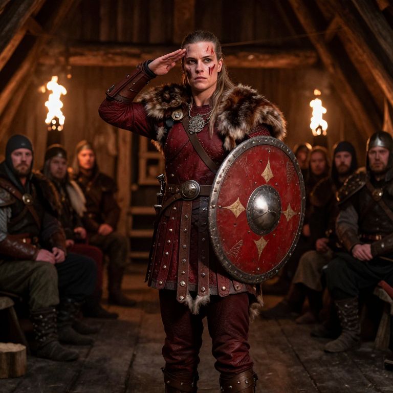 A dramatic full-body shot of a Viking shieldmaiden with a strong, warrior-like face—angular and weathered, with a bold scar across her cheek—wearing a battle-ready faux fur armor in deep crimson and charcoal tones, standing in a dimly lit wooden longhouse during a ritual gathering, torches flickering in the background, her presence radiating authority and fire as she raises her shield in salute to a gathered group of warriors.