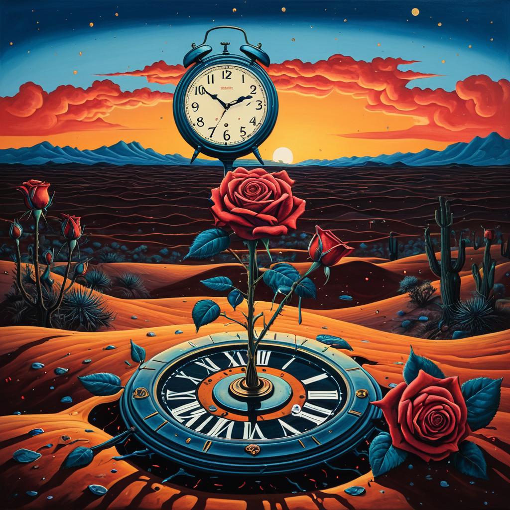 Surreal oil painting of a clock melting over a wilted rose on a surreal desert dusk. Created with humor and vibrant colors, inspired by James Jean and Fernando Botero.