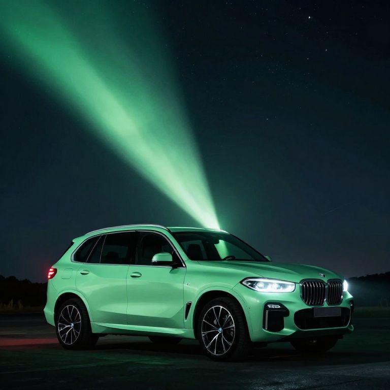 A luminous BMW X5 bathed in ethereal green light casts a radiant beam into the night sky, defying the ordinary boundaries between vehicle and celestial wonder.