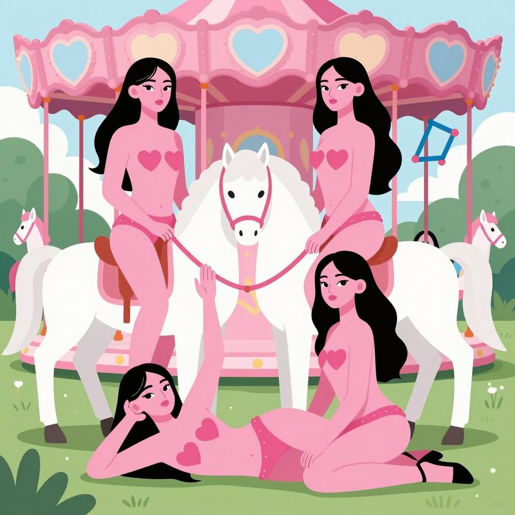 Digital illustration of three women with long black hair and pink skin, wearing pink outfits with heart-shaped pasties. Two women are on a white horse, one standing and the other kneeling, while the third woman lies on the ground with her arm raised. Background includes a pink carousel with heart-shaped windows, green plants, and a broken blue trapeze. The women have intense expressions. Artist in bottom left corner. Bright, colorful, stylized composition.