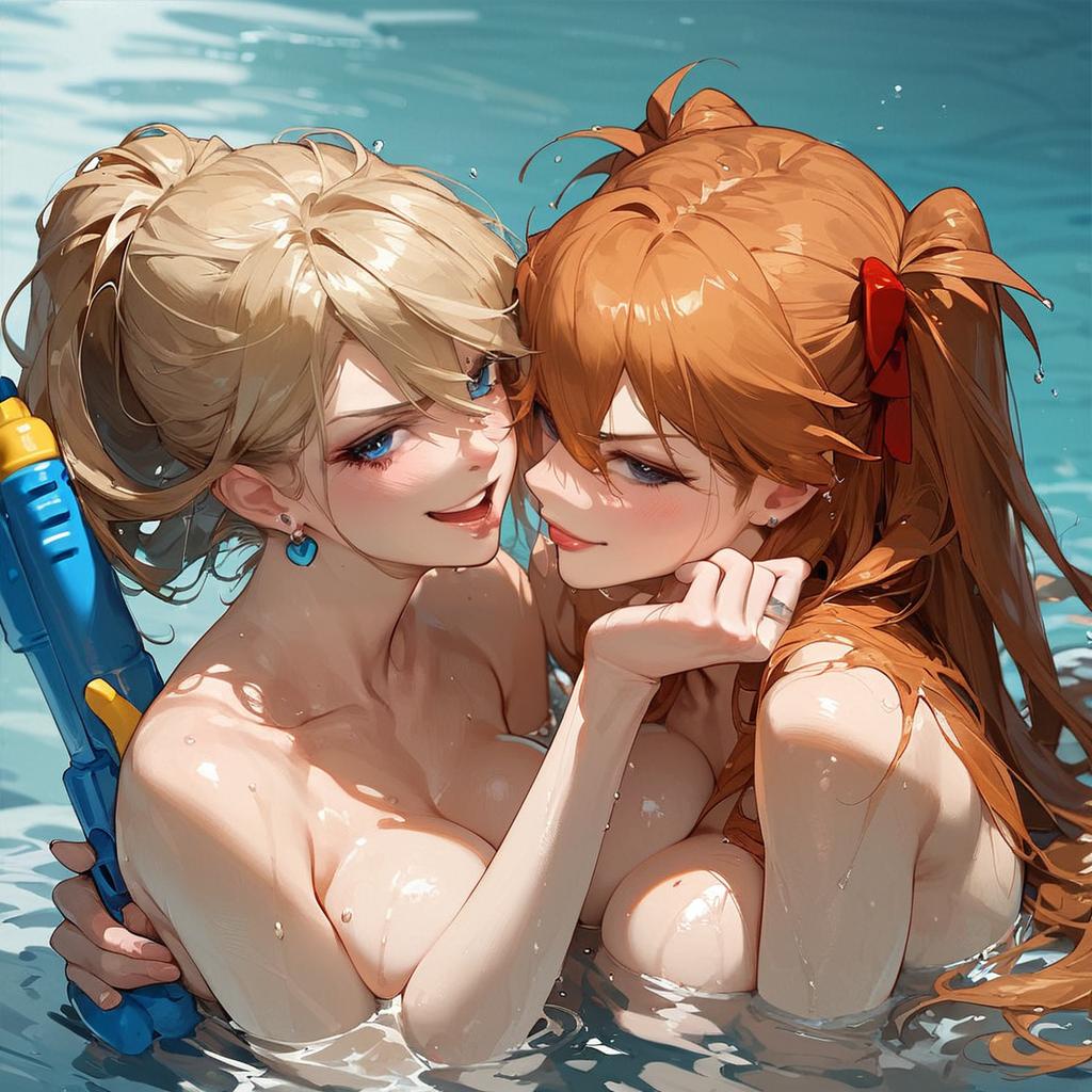 Score_9, score_8_up, score_7_up, score_6_up, score_5_up, score_4_up, source_anime, 2girls, water gun, water, wetayanami rei, smirksouryuu asuka langley, wet, shouting, looking at another