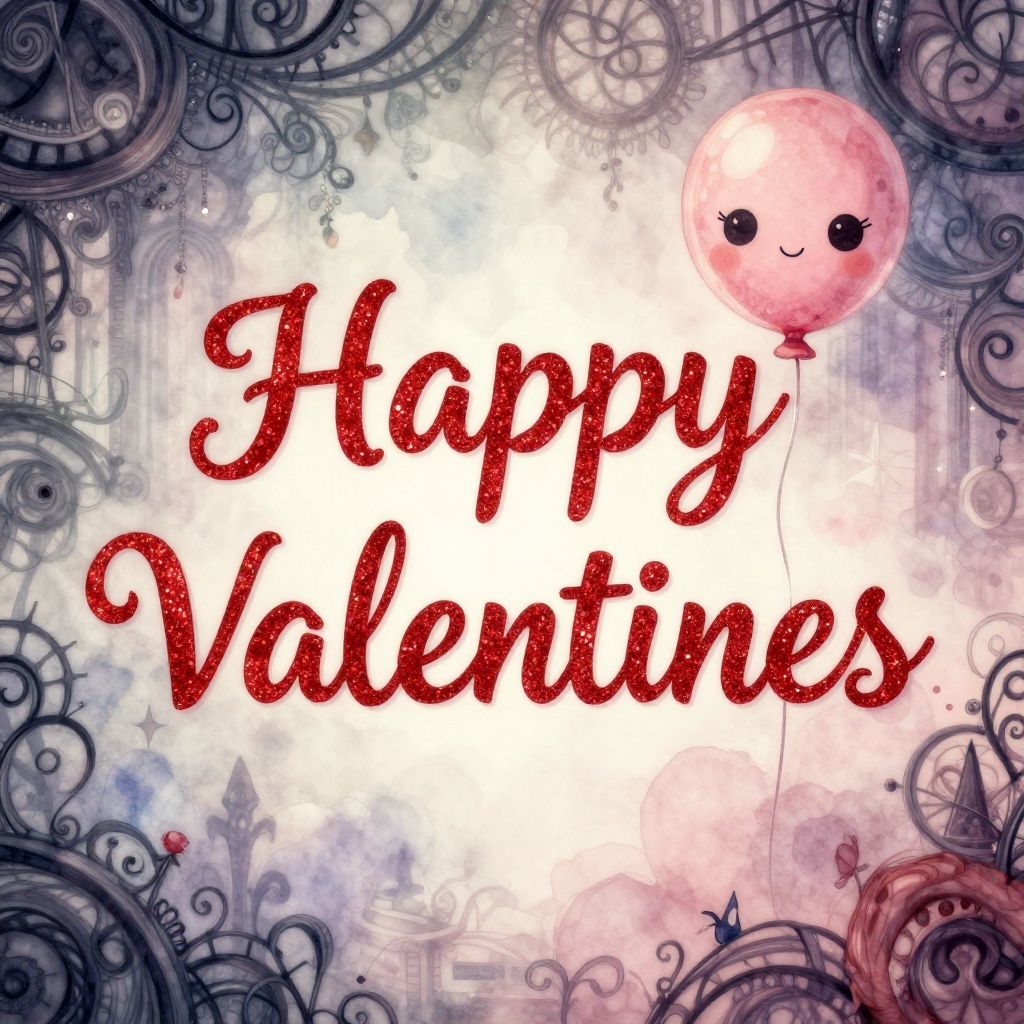 Greeting card style captures redglitter valentines essence, says the word "Happy Valentines" balloon, kawaii, pastel colors watercolor, in the style of Gorjuss, Joan Walsh Anglund, soft-focus and diffused lighting akin to Paolo Roversi, imbued with Tim Burton's macabre touch, Kris Kuksi-like intricate background detail, digital painting, ultra-detailed, cinematic.
