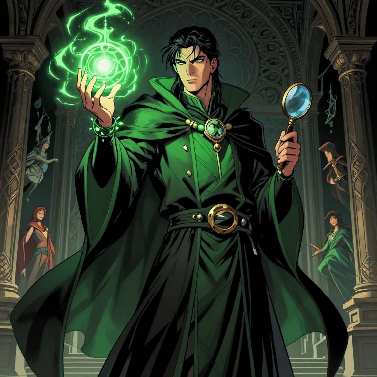 In this captivating comic book-style illustration, a robed omni mage stands confidently, exuding an aura of power and mystique. The mage, adorned in a striking green and black robe, is the central figure, his dark hair adding to his enigmatic presence. His right hand, adorned with a magical bracelet, hovers near a glowing orb of energy, suggesting the manipulation of arcane forces. The mage's left hand, tucked into his front pocket, holds a magnifying glass, hinting at a blend of magical and scholarly knowledge. The background, a rich tapestry of dark, ornate walls and floating figures, enhances the sense of depth and mystery. The overall composition, with the mage centrally positioned and the elements arranged in a balanced yet dynamic manner, creates a visually compelling scene that invites the viewer to explore the narrative unfolding within.
