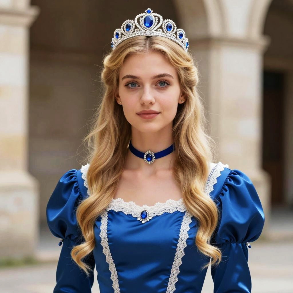 Photograph of a young woman with long, wavy blonde hair wearing a silver tiara with blue gemstones. She has fair skin, blue eyes, and light makeup. She is dressed in a royal blue, puffed-sleeve dress with white lace trim and a matching blue choker adorned with a gemstone. The background features blurred stone arches and columns, suggesting an ancient or medieval setting. The overall style is regal and fairy-tale-like, with a focus on elegance and historical charm.