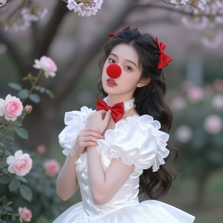 A graceful female Pierrot with a soft white satin ruffle gown, her face youthful and dreamy with rose-colored lips and a subtle sparkle in her eyes, wearing a classic clown nose and tiny red bow, posing in a moonlit garden with blooming roses and cherry blossoms, soft bokeh background, natural lighting, film-like realism
