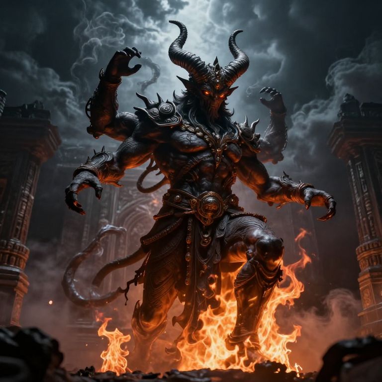 Powerful Baphomet figure emerging from flames with smoky tendrils, mythic and dark fantasy style, intricate horn and body textures, glowing eyes piercing through a swirling storm of dark clouds, dramatic dynamic pose with a backdrop of an ancient mystical temple.