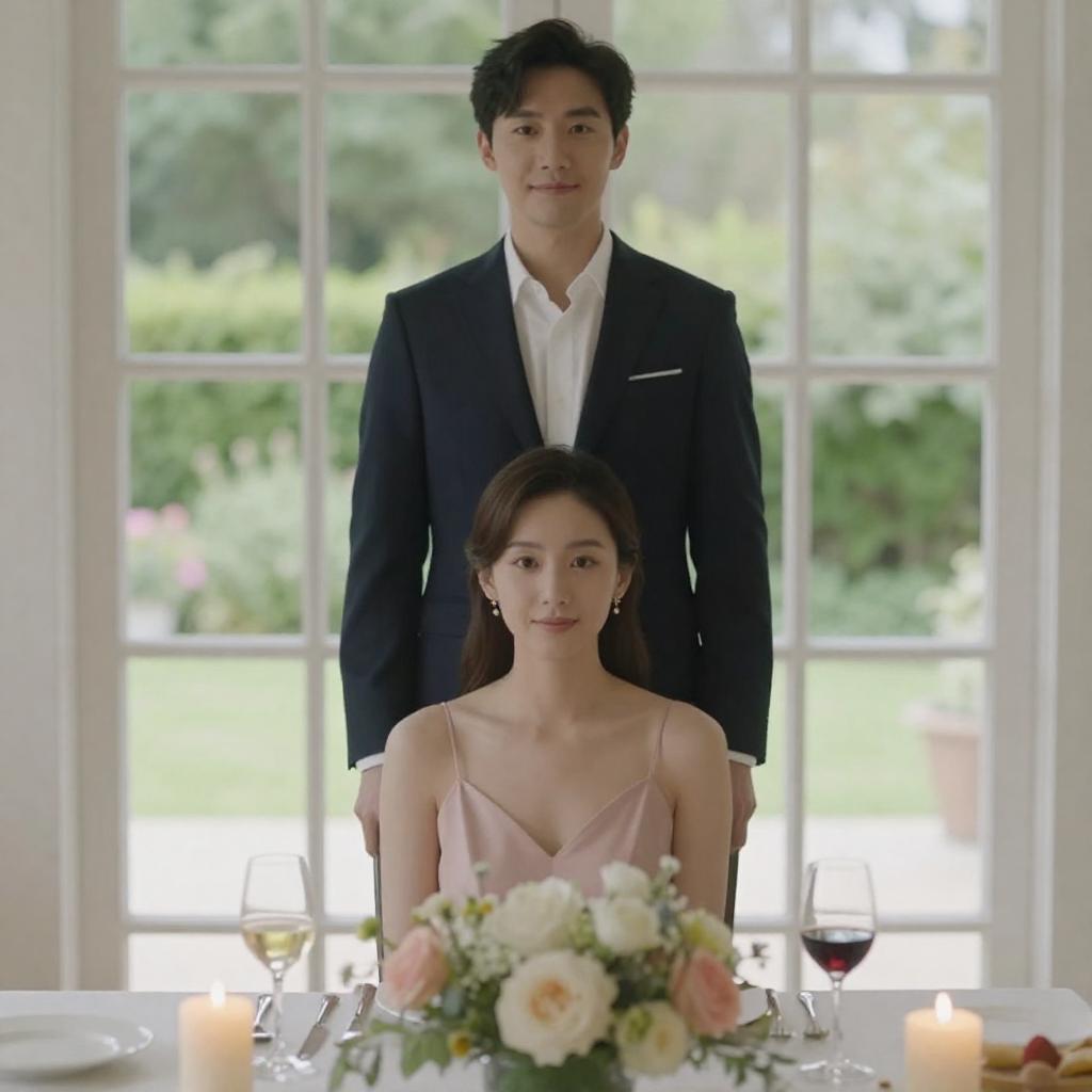 Photograph of a man in a dark suit standing behind a woman in a pink spaghetti-strap dress, both smiling. They are in a sunlit room with large windows showing a green garden outside. The table in front has a festive arrangement of candles, flowers, and wine glasses.
