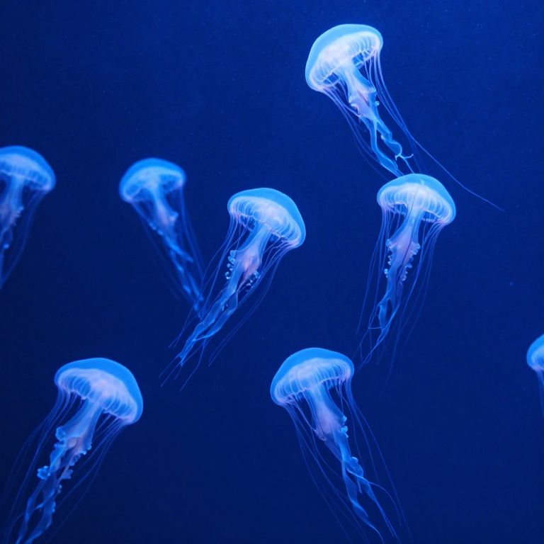 Photograph of glowing blue jellyfish with translucent, flowing tentacles against a deep blue underwater background, creating a mesmerizing, ethereal scene.