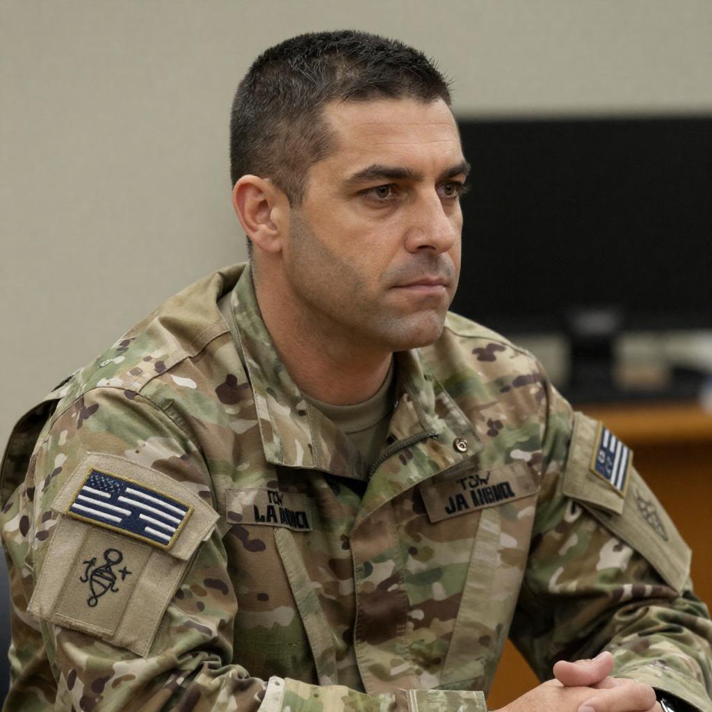 Photograph of a middle-aged man with short, dark hair, wearing a U.S. Army camouflage uniform with patches on the sleeves. He sits slightly turned to the side, looking off to the right with a serious expression. The background is blurred, with a dark, indistinct object behind him.