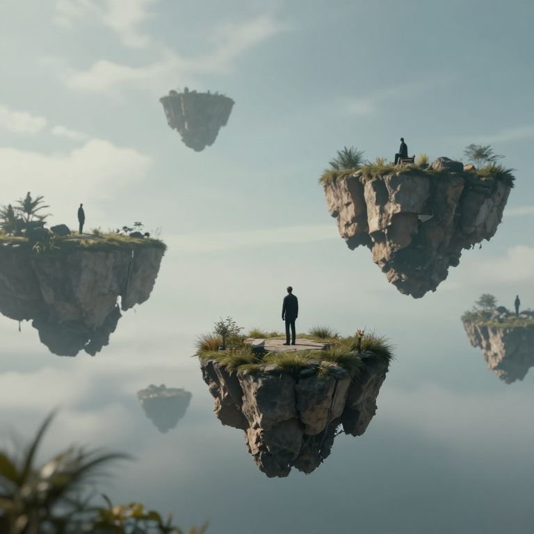 A surreal 3D-rendered scene depicts floating islands suspended in a metaphysical sky, each inhabited by solitary figures, evoking a sense of existential contemplation and mystery through its dreamlike, high-definition visual effects.