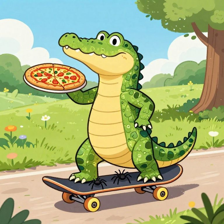 Romantic Crocodile Skateboarding with Pizza